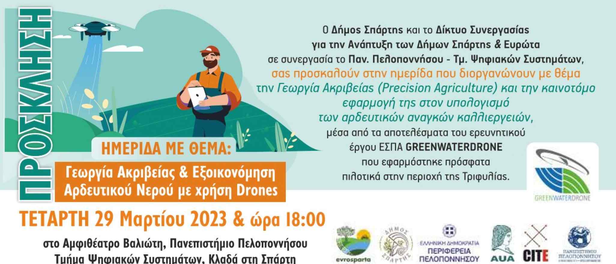 Αύριο Τετάρτη 29 Μαρτίου και ώρα 18:00 διοργανώνεται από το Δίκτυο Συνεργασίας για την Ανάπτυξη των Δήμων Σπάρτης και Ευρώτα ημερίδα με θέμα την Γεωργία Ακριβείας (Precision Agriculture) και στην καινοτόμο εφαρμογή της στον υπολογισμό των αρδευτικών αναγκών καλλιεργειών.