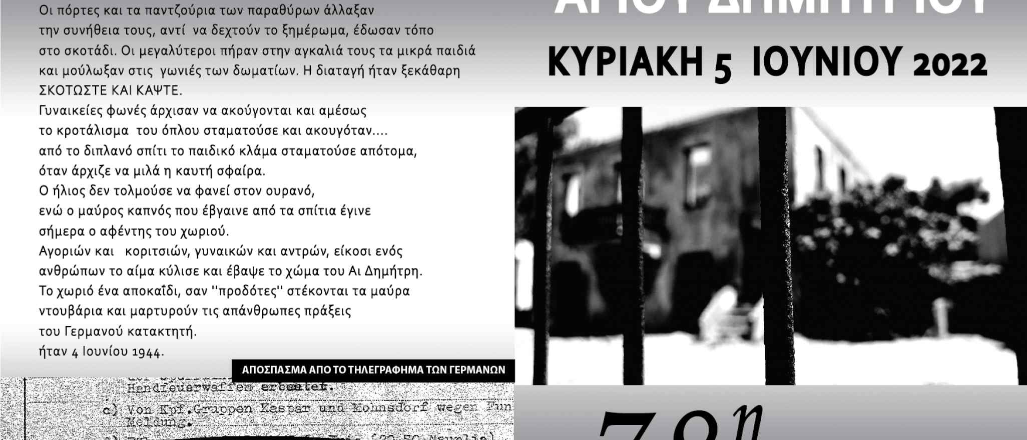 ΕΚΔΗΛΩΣΕΙΣ ΓΙΑ ΤΗΝ 78Η ΕΠΕΤΕΙΟ ΜΝΗΜΗΣ ΤΟΥ ΟΛΟΚΑΥΤΩΜΑΤΟΣ ΤΟΥ ΑΓΙΟΥ ΔΗΜΗΤΡΙΟΥ ΖΑΡΑΚΑ