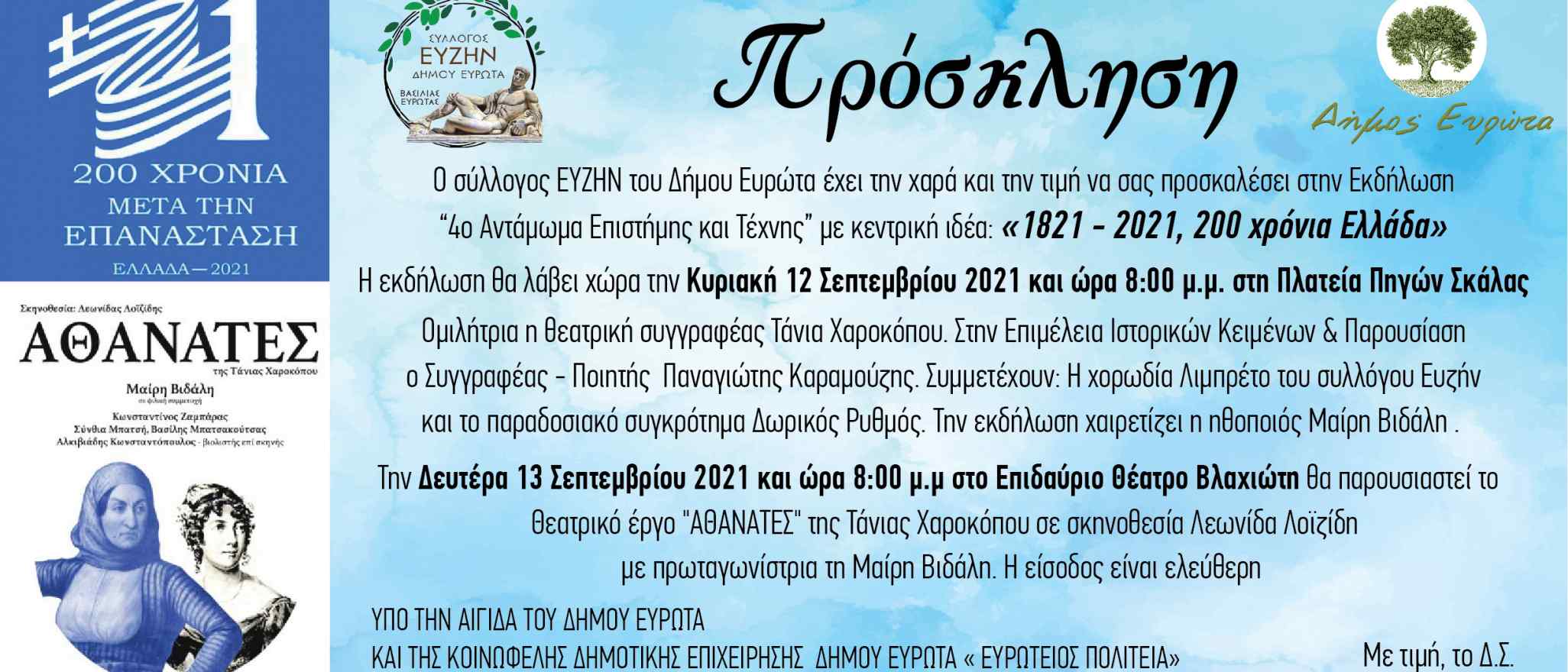 Ο Δήμος Ευρώτα και ο σύλλογος ΕΥΖΗΝ διοργανώνουν και φέτος διήμερες εκδηλώσεις, εμπνευσμένες από τα 200 χρόνια από την Ελληνική Επανάσταση. Ειδικότερα,