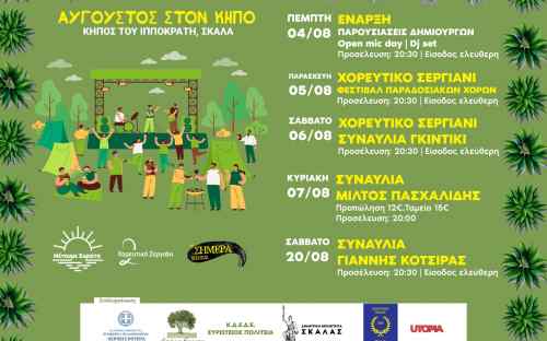 «ΑΥΓΟΥΣΤΟΣ ΣΤΟΝ ΚΗΠΟ»: ΠΕΝΘΗΜΕΡΕΣ ΦΕΣΤΙΒΑΛΙΚΕΣ ΕΚΔΗΛΩΣΕΙΣ ΣΤΟΝ ΚΗΠΟ ΤΟΥ ΙΠΠΟΚΡΑΤΗ ΣΤΗ ΣΚΑΛΑ