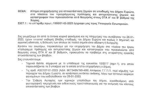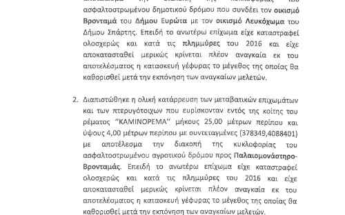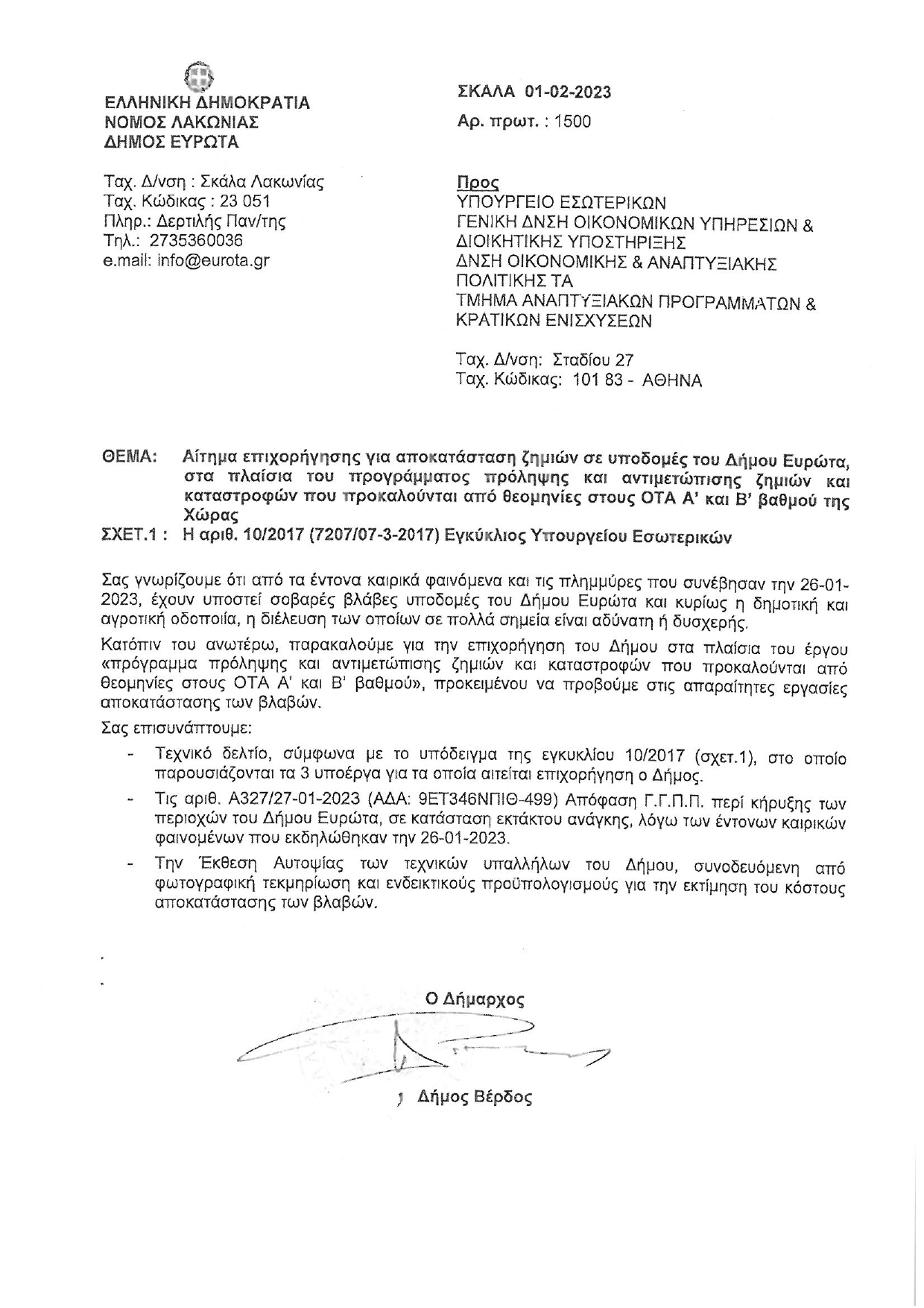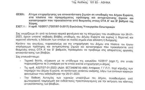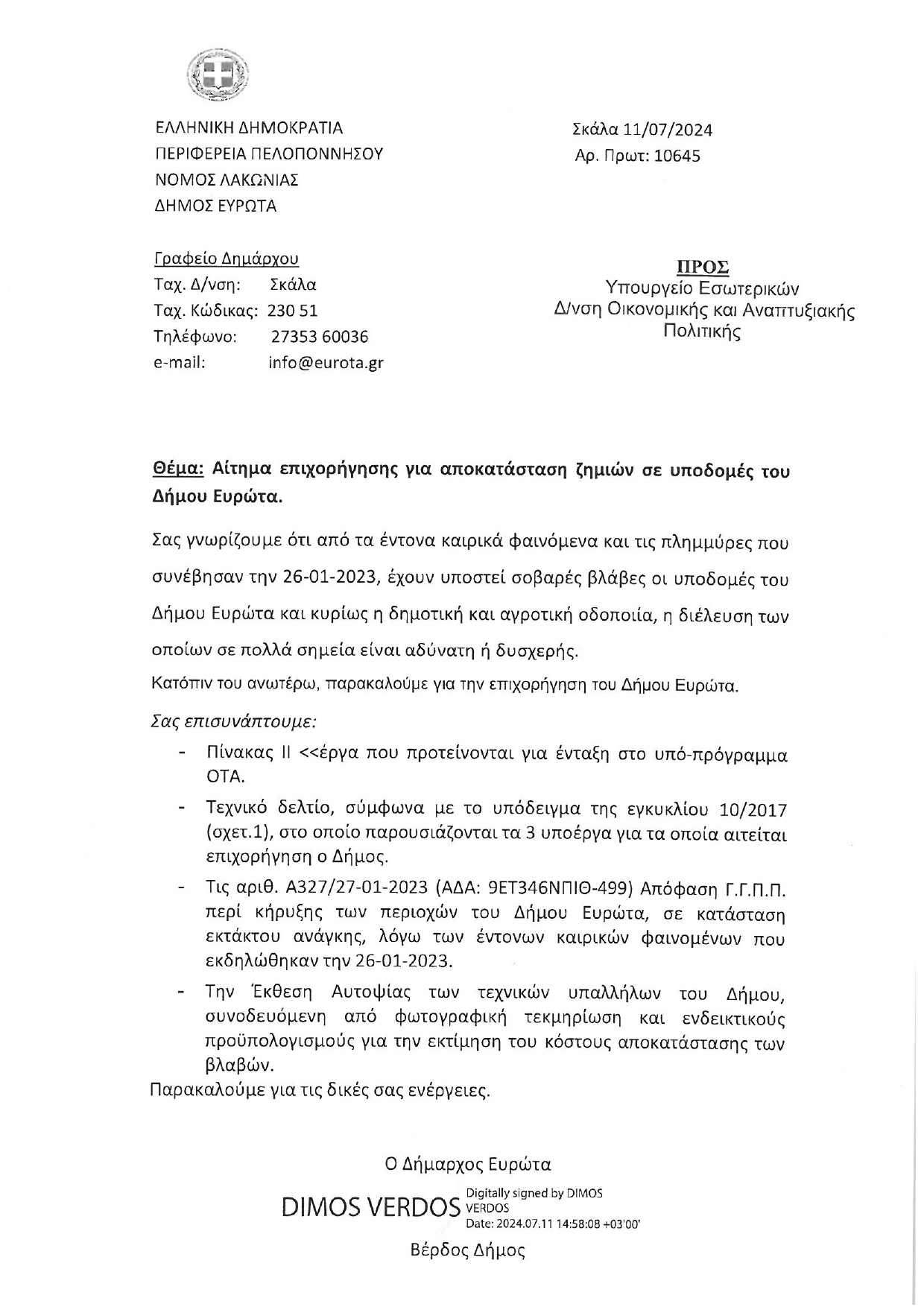 Η Δημοτική Αρχή Ευρώτα όχι μόνο δεν είναι απούσα, αλλά ήταν αυτή που πρώτη ενημέρωσε, διεκδίκησε και συνεργάστηκε με τα συναρμόδια Υπουργεία και την Περιφέρεια, ώστε να υπάρξει ουσιαστική λύση στο πρόβλημα. Επισημαίνουμε ενδεικτικά τα Αιτήματα που έχουμε καταθέσει για να διεκδικήσουμε την συνολική χρηματοδότηση των 2.700.000 € , τα υπ΄ αριθμ. πρωτ.: 1500/01-02-2023, 4511/20-03-2024, 10645/11-07-2024, 19861/04-12-2024 έγγραφα μας προς τα αρμόδια Υπουργεία & Περιφέρεια για την επιχορήγηση και αποκατάσταση των ζημιών.