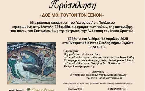 Το Σάββατο του Λαζάρου, 12 Απριλίου 2025, στις 7 μ.μ., στο Πνευματικό Κέντρο Σκάλας του Δήμου Ευρώτα, θα πραγματοποιηθεί μια μοναδική μουσική παράσταση – οδοιπορικό στην Μεγάλη Εβδομάδα και την Ανάσταση, με τον τίτλο: «Δος μοι τούτον τον ξένον».