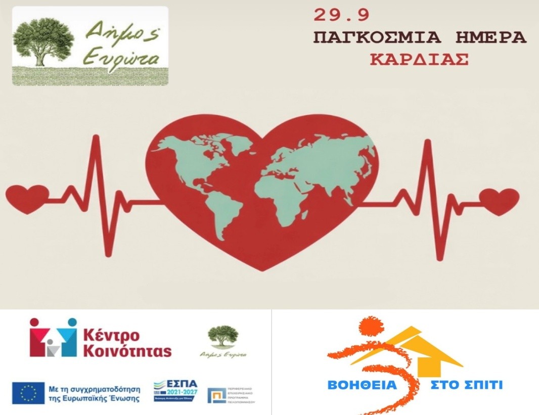 Με αφορμή την Παγκόσμια  Ημέρα  Καρδιάς, Το Αυτοτελές Τμήμα Κοινωνικής Προστασίας, Δημόσιας Υγείας και Παιδείας του Δήμου Ευρώτα σε συνεργασία με το Κέντρο Υγείας Βλαχιώτη, ΚΑΠΗ και Κέντρο Κοινότητας Δήμου Ευρώτα  θα συνεχίσει τη διεξαγωγή προληπτικού καρδιολογικού ελέγχου, μετρήσεις ζωτικών σημείων & τεστ μνήμης, την Τρίτη 4 Νοεμβρίου 2025 στο Αγροτικό Ιατρείο της Τοπικής Κοινότητας Δαφνίου  του Δήμου Ευρώτα, από τις 10:00π.μ έως 13:00μ.μ .