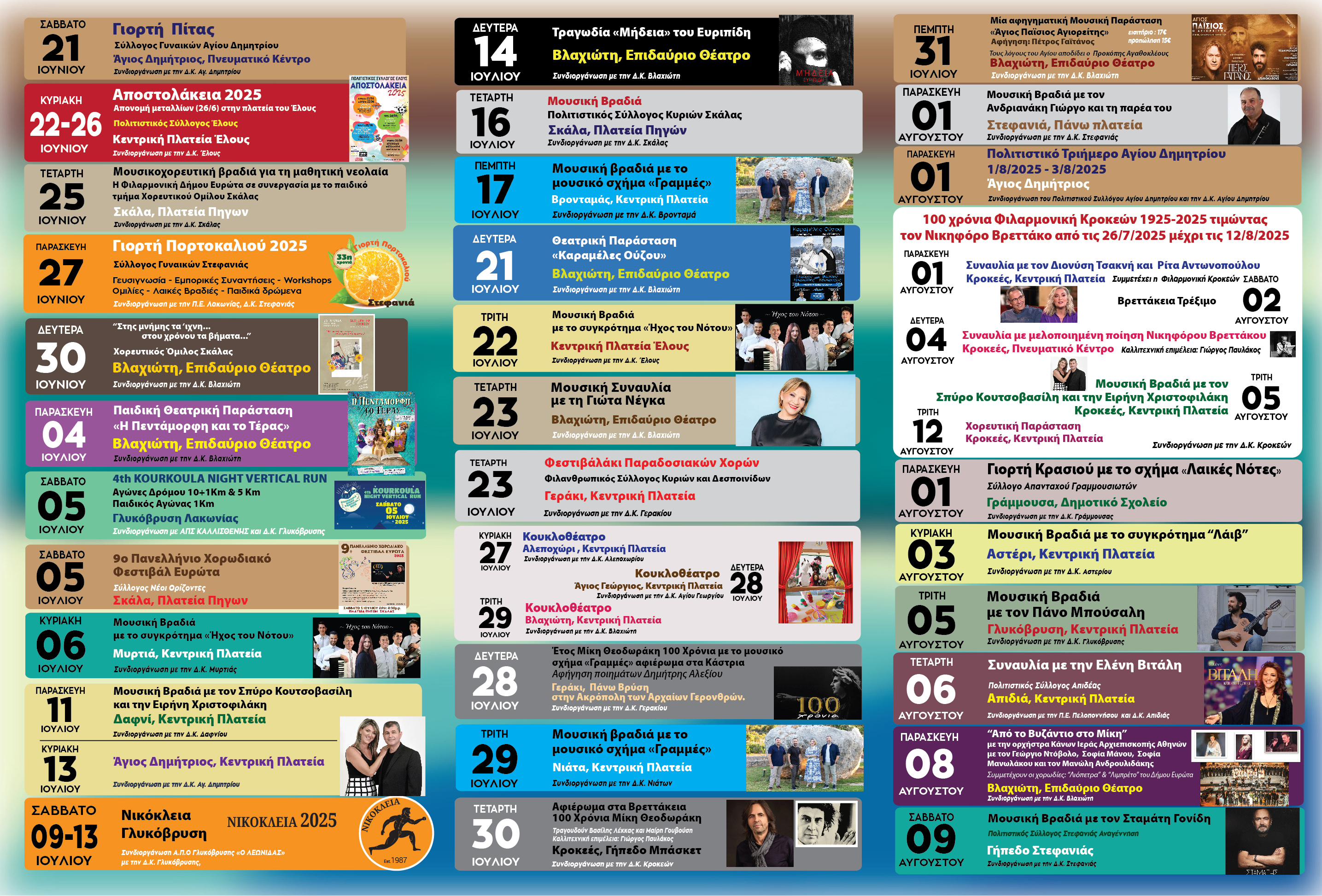 Το Πρόγραμμα Πολιτιστικών & Αθλητικών Εκδηλώσεων Καλοκαίρι 2025 περιλαμβάνει: