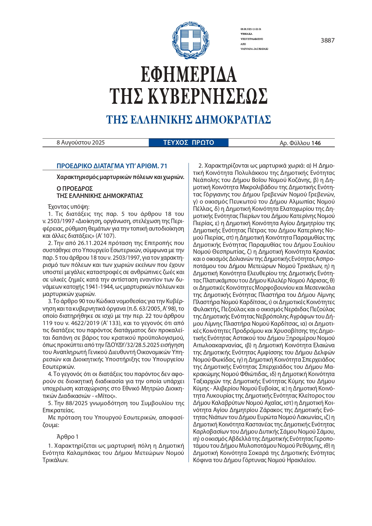 Με ιδιαίτερη συγκίνηση και υπερηφάνεια, ο Δήμος Ευρώτα ανακοινώνει ότι, σύμφωνα με το Προεδρικό Διάταγμα υπ’ αριθμ. 71/2025 (ΦΕΚ Α’ 146/08.08.2025), η Δημοτική Κοινότητα Αγίου Δημητρίου Ζάρακος του Δήμου Ευρώτα χαρακτηρίστηκε επίσημα ως Μαρτυρικό Χωριό.