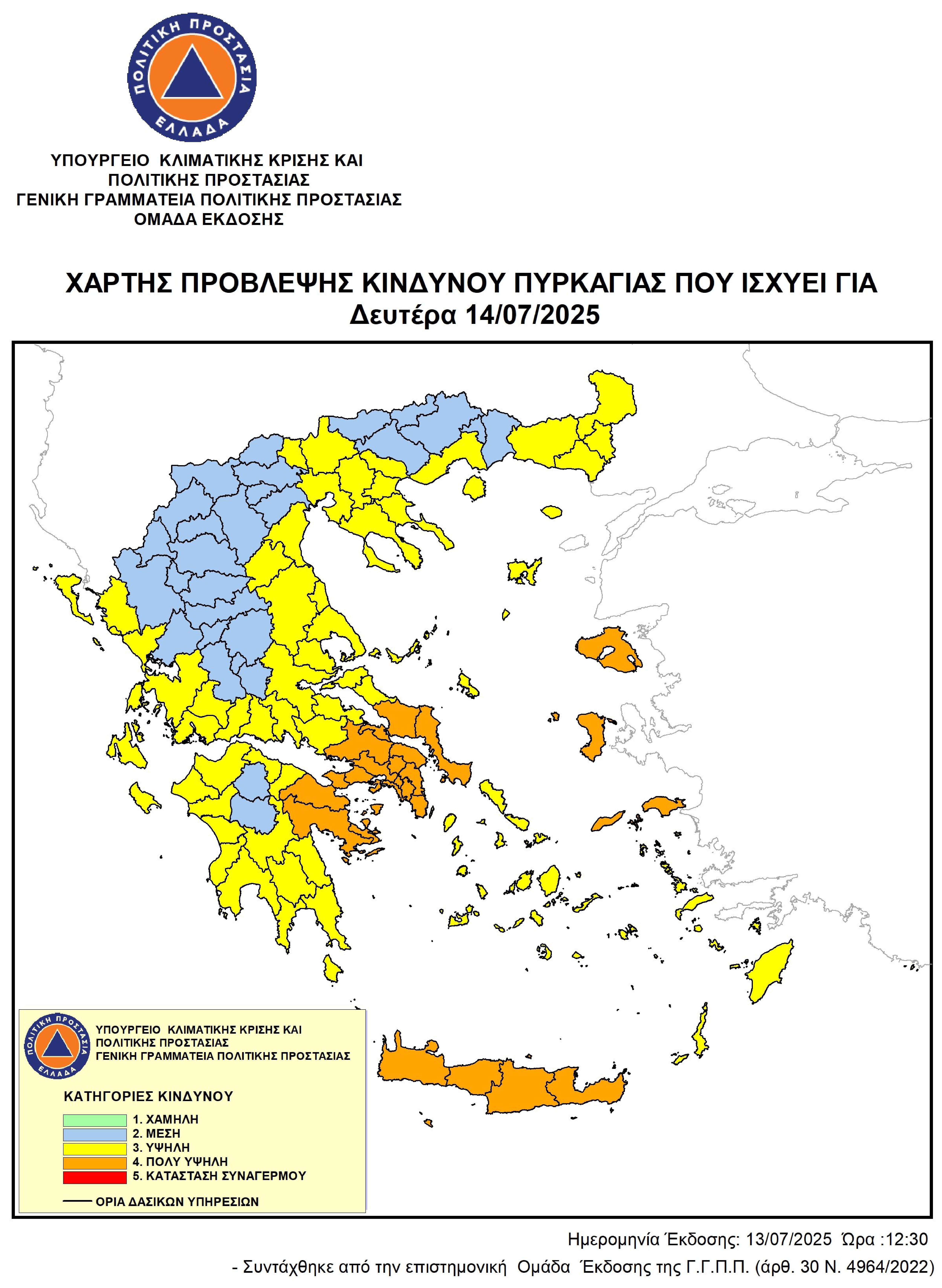 ΠΑΡΑΜΕΝΕΙ ΥΨΗΛΟΣ Ο ΚΙΝΔΥΝΟΣ ΠΥΡΚΑΓΙΑΣ (ΚΑΤΗΓΟΡΙΑ ΚΙΝΔΥΝΟΥ 3) ΚΑΙ ΤΗΝ ΔΕΥΤΕΡΑ 14-07-2025 ΣΤΗ ΛΑΚΩΝΙΑ – ΟΔΗΓΙΕΣ ΠΡΟΣΤΑΣΙΑΣ – ΑΠΑΓΟΡΕΥΣΗ ΚΥΚΛΟΦΟΡΙΑΣ ΣΕ ΔΑΣΙΚΕΣ ΕΚΤΑΣΕΙΣ