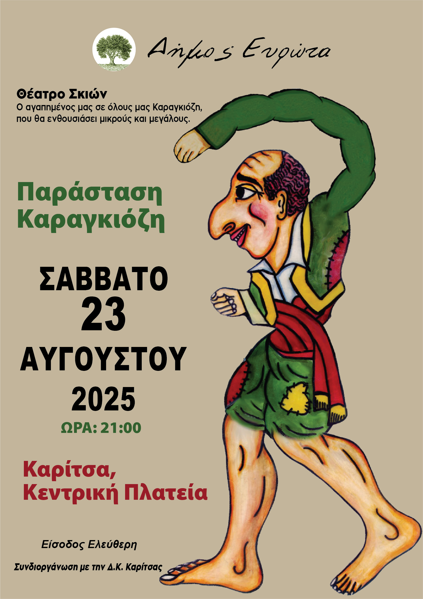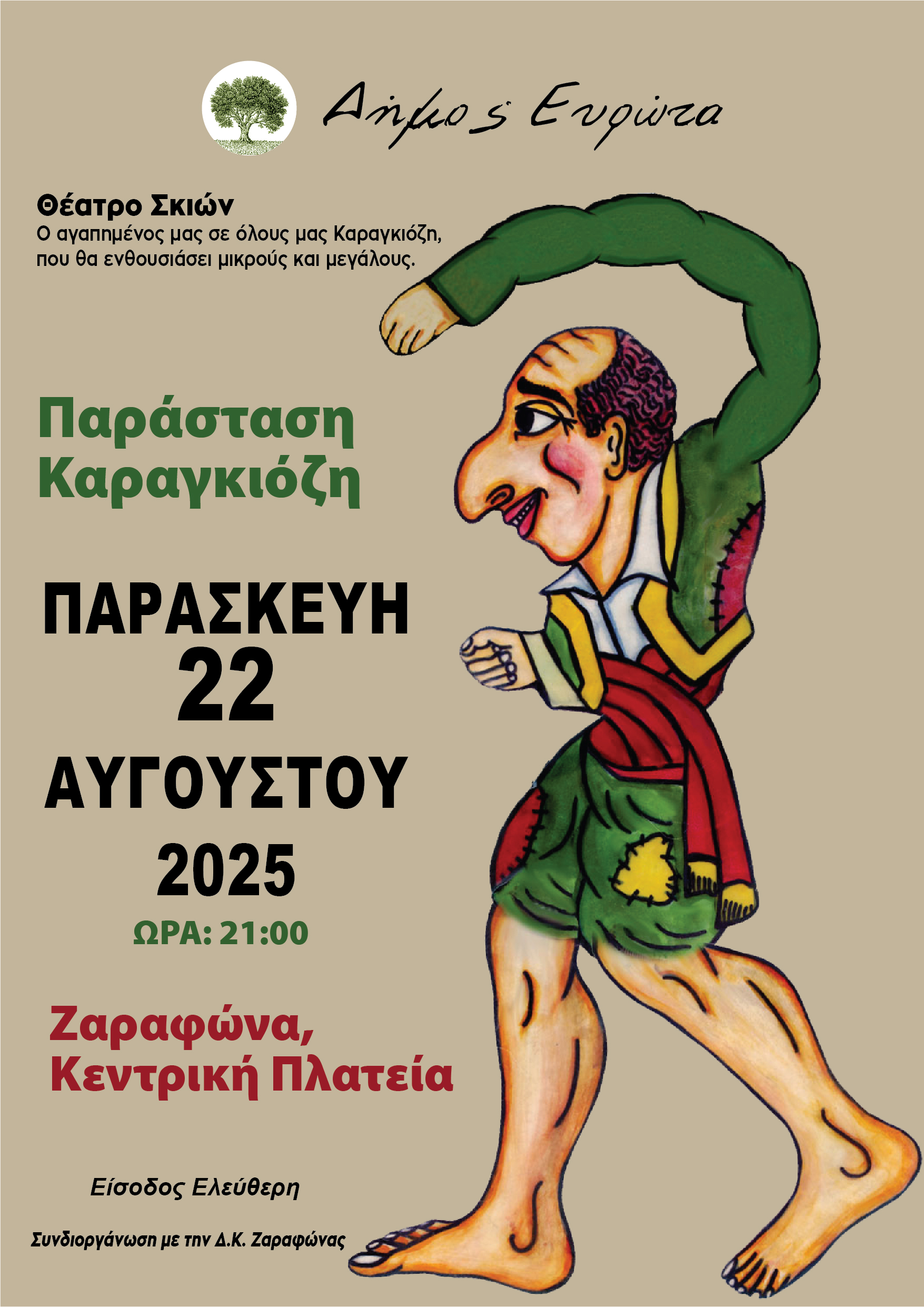 Ο Δήμος Ευρώτα, σε συνεργασία με τις Τοπικές Κοινότητες Ζαραφώνας και Καρίτσας, προσκαλεί μικρούς και μεγάλους σε δύο μοναδικές βραδιές Θεάτρου Σκιών με τον αγαπημένο μας Καραγκιόζη.