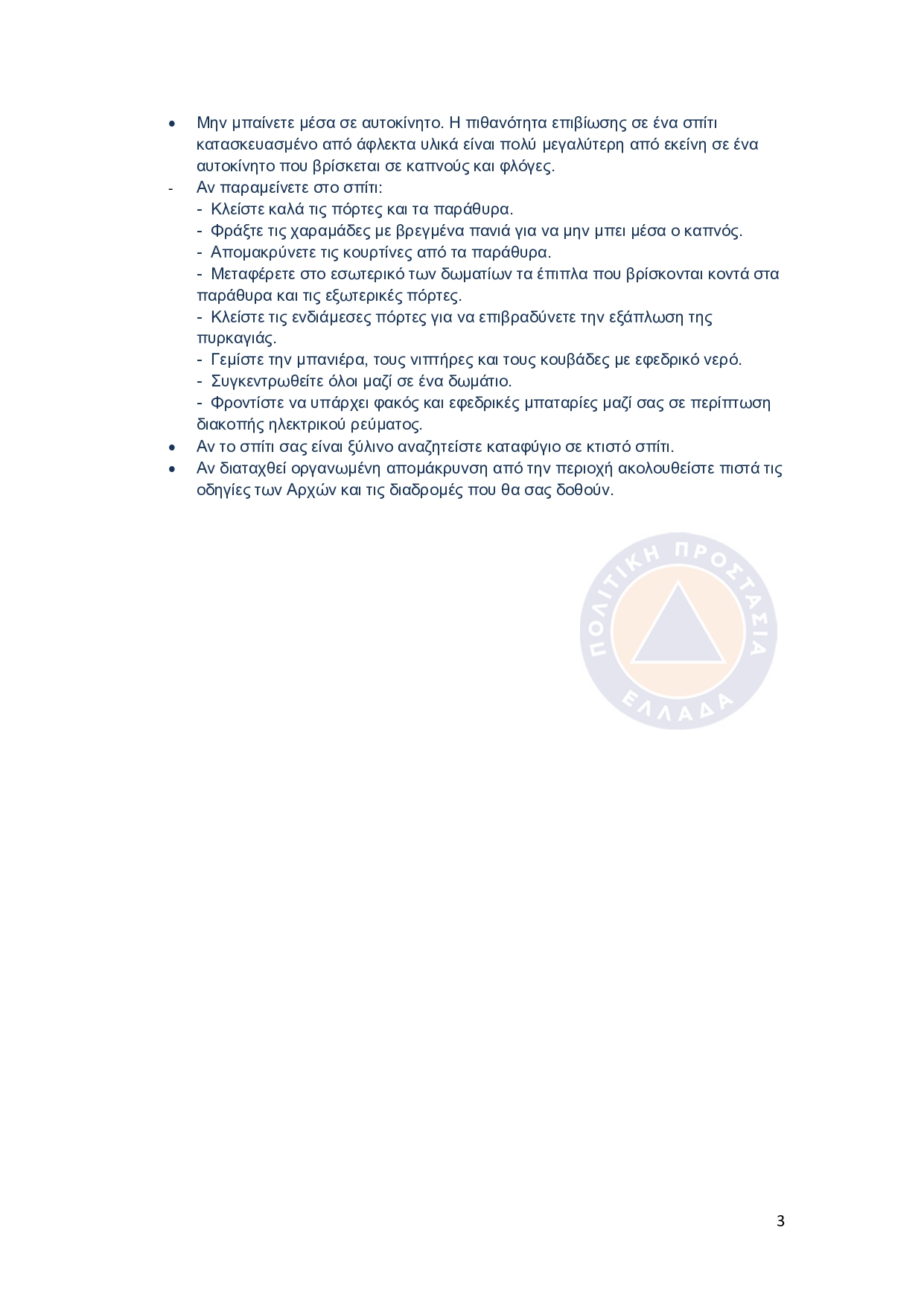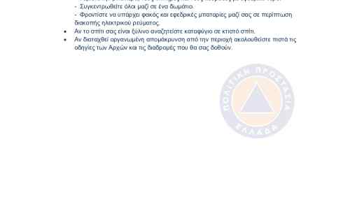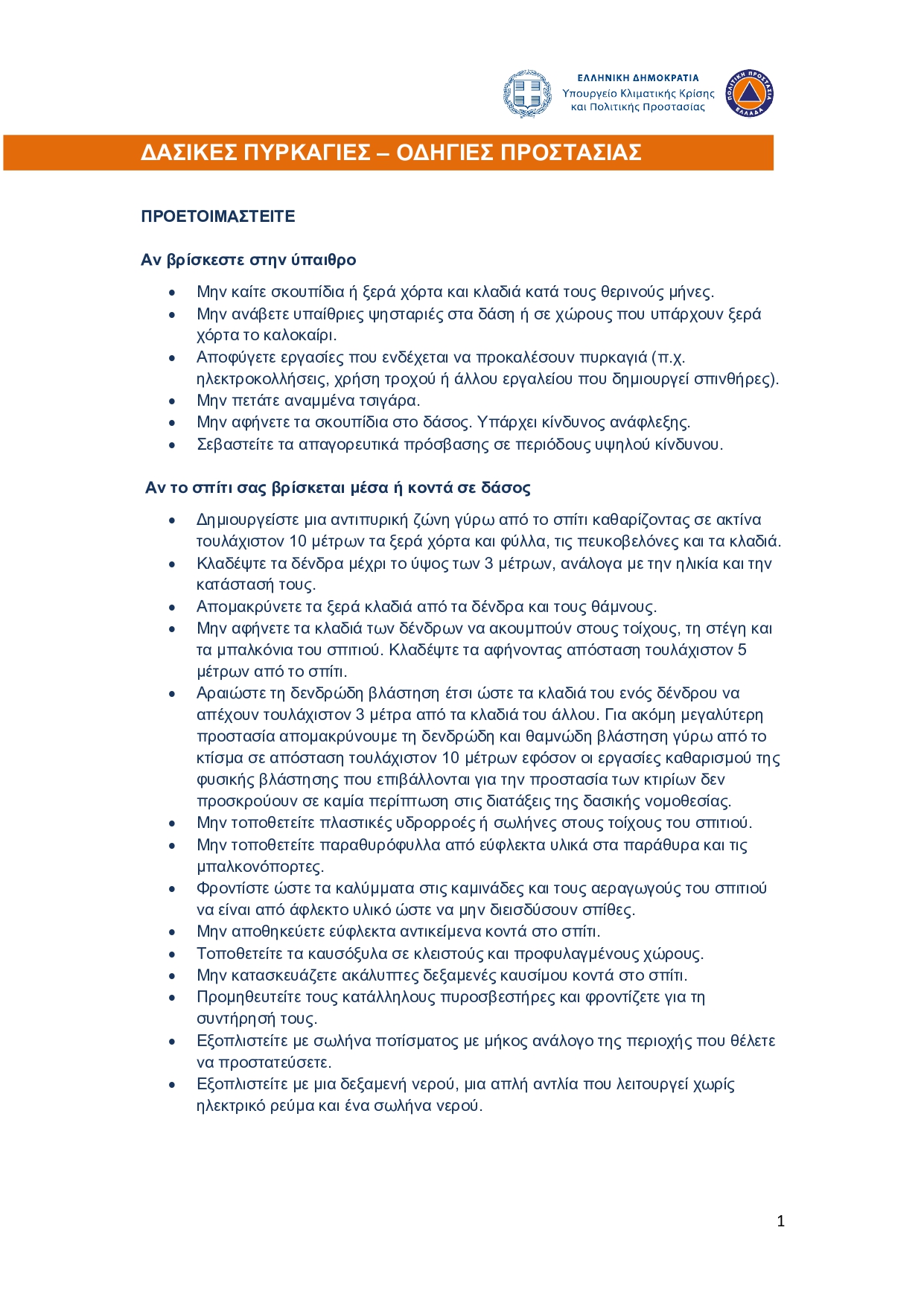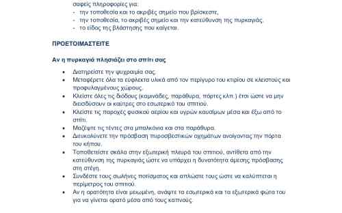 Για περισσότερες πληροφορίες και οδηγίες αυτοπροστασίας από τους κινδύνους των δασικών πυρκαγιών, οι πολίτες μπορούν να επισκεφθούν την ιστοσελίδα της Γενικής Γραμματείας Πολιτικής Προστασίας στην ηλεκτρονική διεύθυνση https://civilprotection.gov.gr.