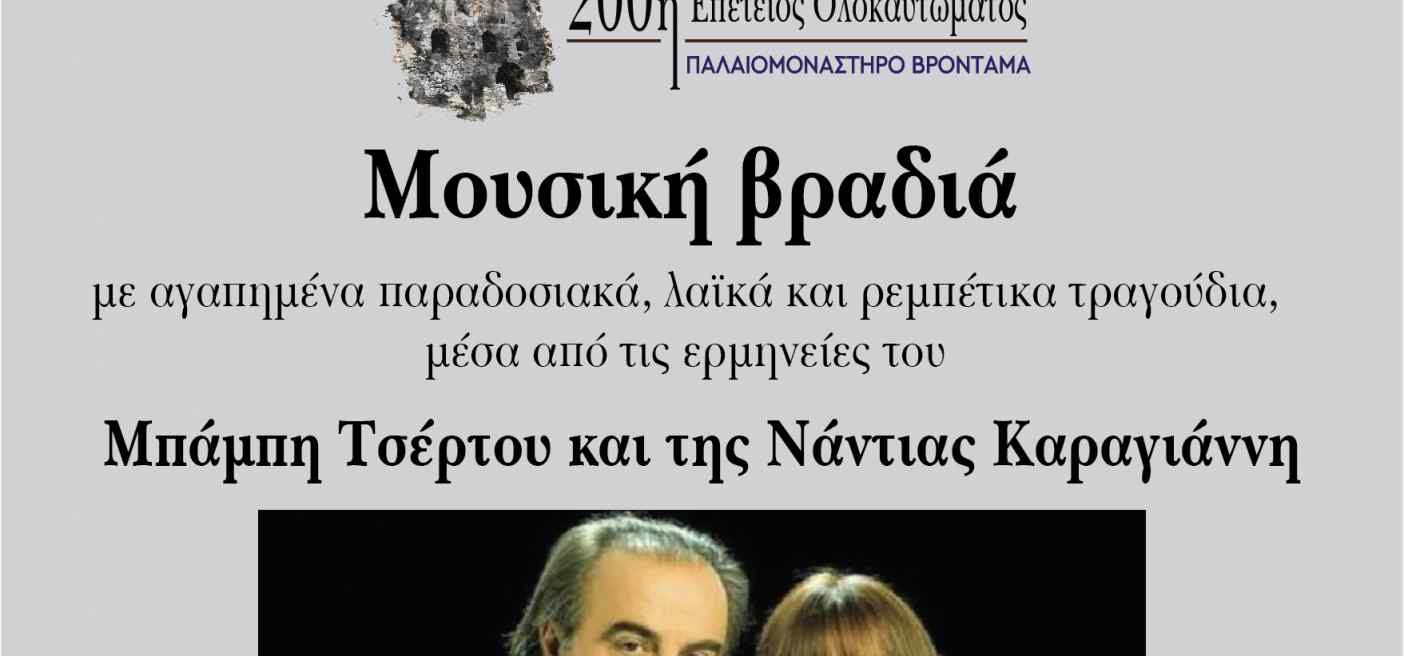 Ο Δήμος Ευρώτα σας προσκαλεί σε μια μοναδική μουσική βραδιά, τη Δευτέρα 15 Σεπτεμβρίου 2025 και ώρα 21:30, στην κεντρική πλατεία Βρονταμά, στο πλαίσιο των εκδηλώσεων για τα 200 χρόνια από το Ολοκαύτωμα του Παλαιομονάστηρου Βρονταμά.